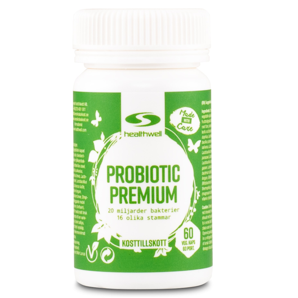 Healthwell Probiotic Premium erbjuder ett gediget probiotiskt tillskott med 20 miljarder CFU från 16 olika bakteriestammar och syrafasta kapslar som säkerställer hög överlevnad. Den synbiotiska formeln med tillsatta prebiotiska fibrer, C- och B2-vitamin ger ytterligare näringsvärde.